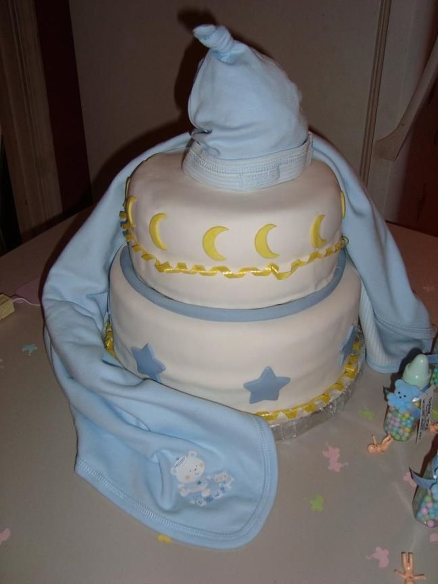 This a baby shower cake I did late friday night for a friends shower it was very rushed. It is covered in Satin Ice with Satin Ice moons and stars. The cake was also dropped in a thunder storm so The blanket is used to cover up the opps.