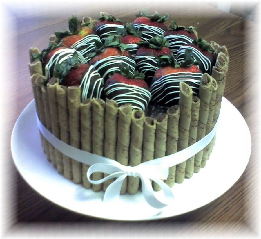 Scratch chocolate fudge for one layer & yellow for another layer; filled & covered with chocolate ganache; wrapped with cookies; topped with chocolate-dipped strawberries. TFL!