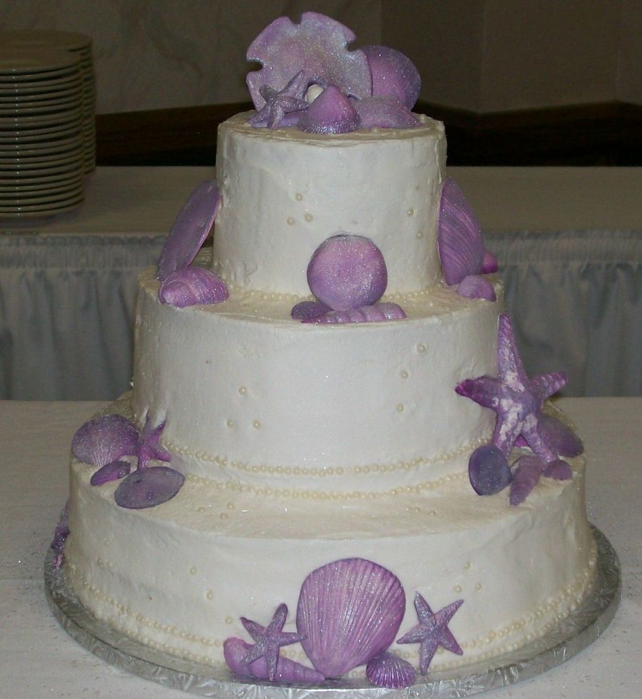 14", 10" and 6" round cake used for this wedding cake. Decorated with buttercream/cream cheese since it was a carrot cake. Sea shells air brushed and dusted with glitter for sparkle added for decoration along with pearl degree at base of each tier.