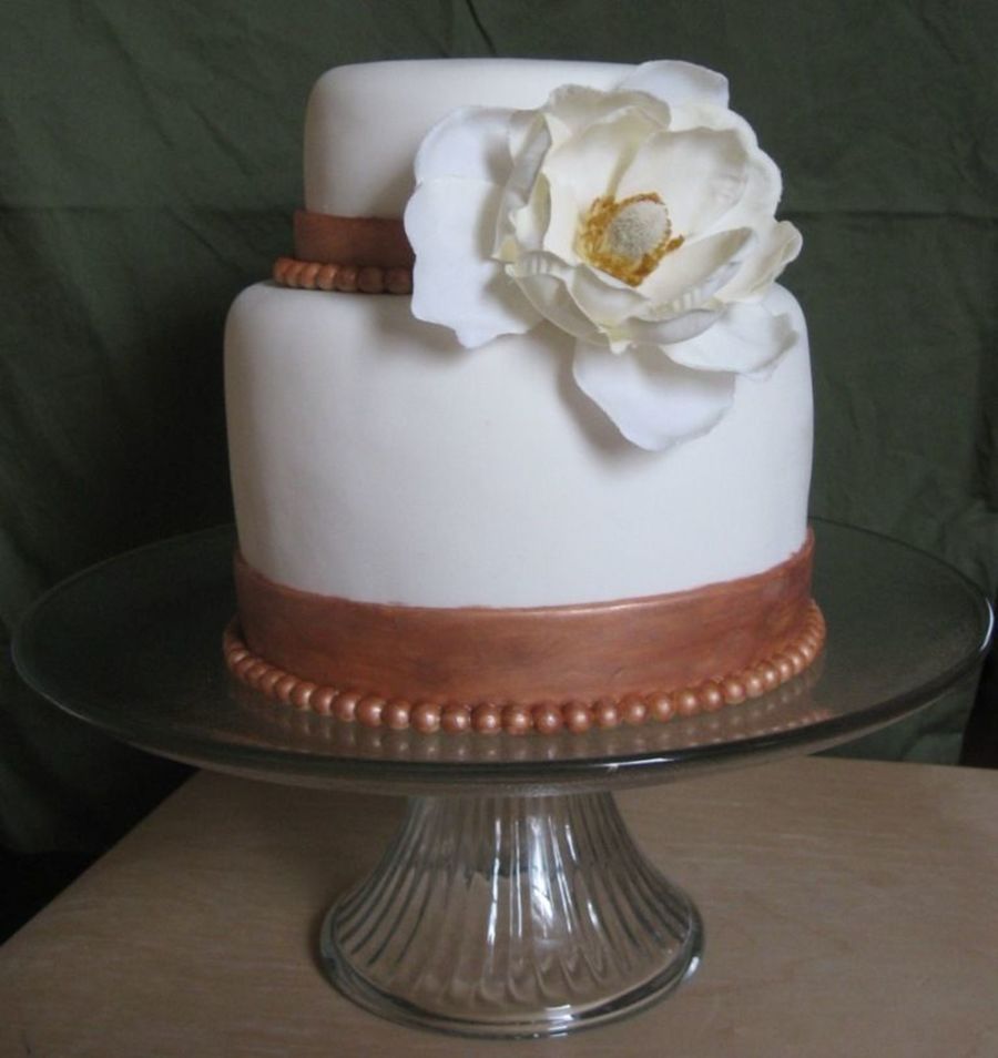 This cake was for my husband's niece - just a small cake for the second dinner they had. Almond cake with raspberry cream and vanilla buttercream, looked so pretty to cut!. Gluten free and low sugar but you would have never known - one of the best tasting cakes yet. 6" cake with a single layer 4" on top. Painted with bronze luster dust and used a silk flower.