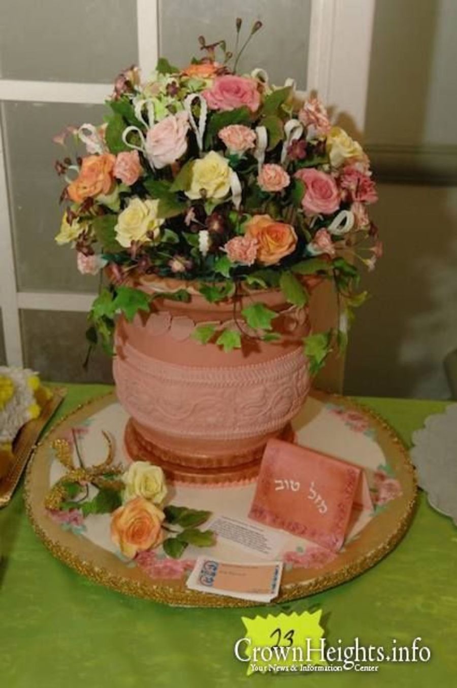 Flowerpot cake covered in fondant with gumpaste roses, carnations, hydrangeas and small filler flowers on a decorated cake board created for an "engagement party" for a cake auction to raise money for charity