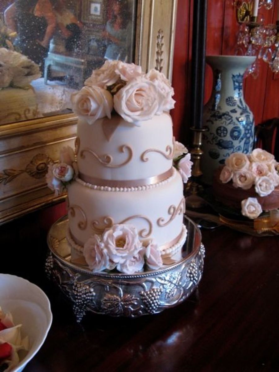 This was my first wedding cake and I was thankful it was smaller. The bride wanted the swirls to match the ribbon and roses. The fondantt is a light cream which doesn't show up very well.