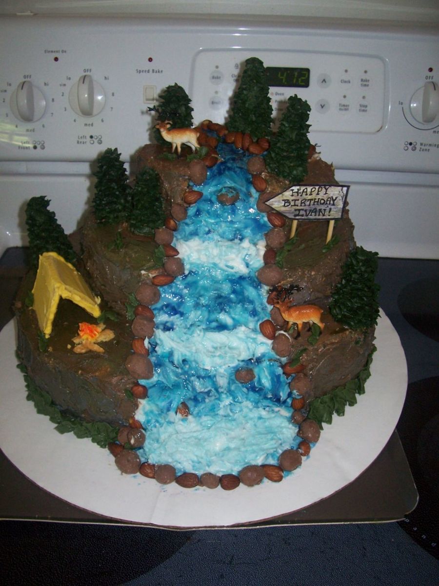 Thanks to all the neat ideas on here, this is my concoction of a waterfall cake. Marble cake with BC icing, graham cracker tent, cone trees, chocolate covered nuts and almonds for the stones, and piping gel on the "water" thanks for looking!!