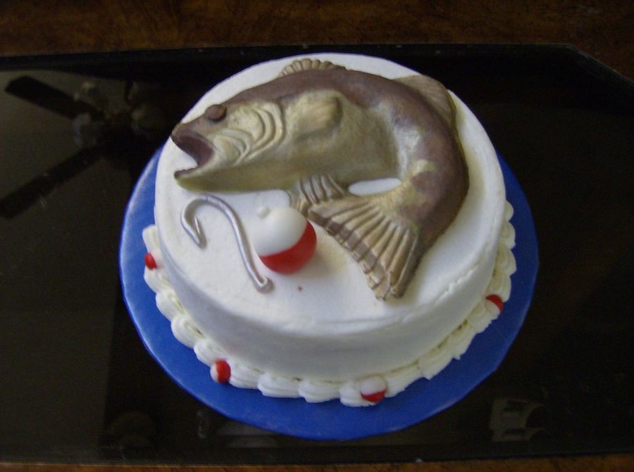 I made 3 cakes for family members for Father's Day, had all of 3 hours to finish, so not a LOT of details! 6" cakes iced in buttercream. This one is a fishing theme - painted chocolate bass, fondant bobber and hook. For my brother-in-law who loves to fish - he was here on business and his family was back home in Minnesota. Thanks for looking!