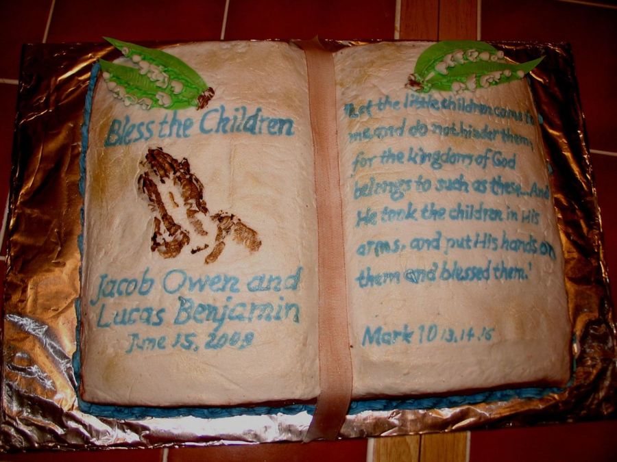 This was done for my twin grandson's baptism. It the first book cake I've ever done. I did an FBCT and added lily-of-the-valley made of gum paste. then used bronze pearl dust on the sides and gold pearl dust on the pages to add an antique appearance. It turned out sort of nice.