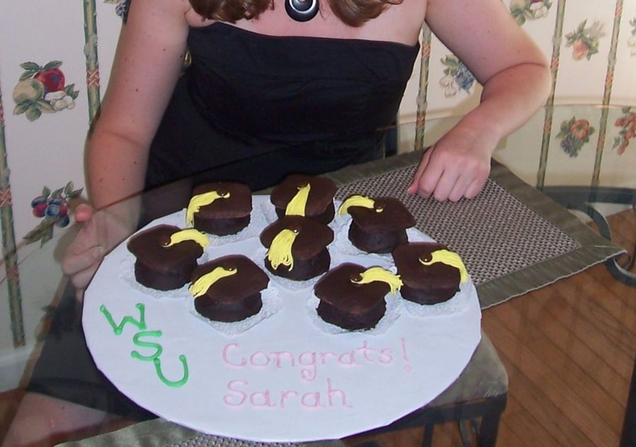 These are brownie cupcakes turned upside-down and topped with a square chocolate covered graham cracker. The tassles are made of fondant.