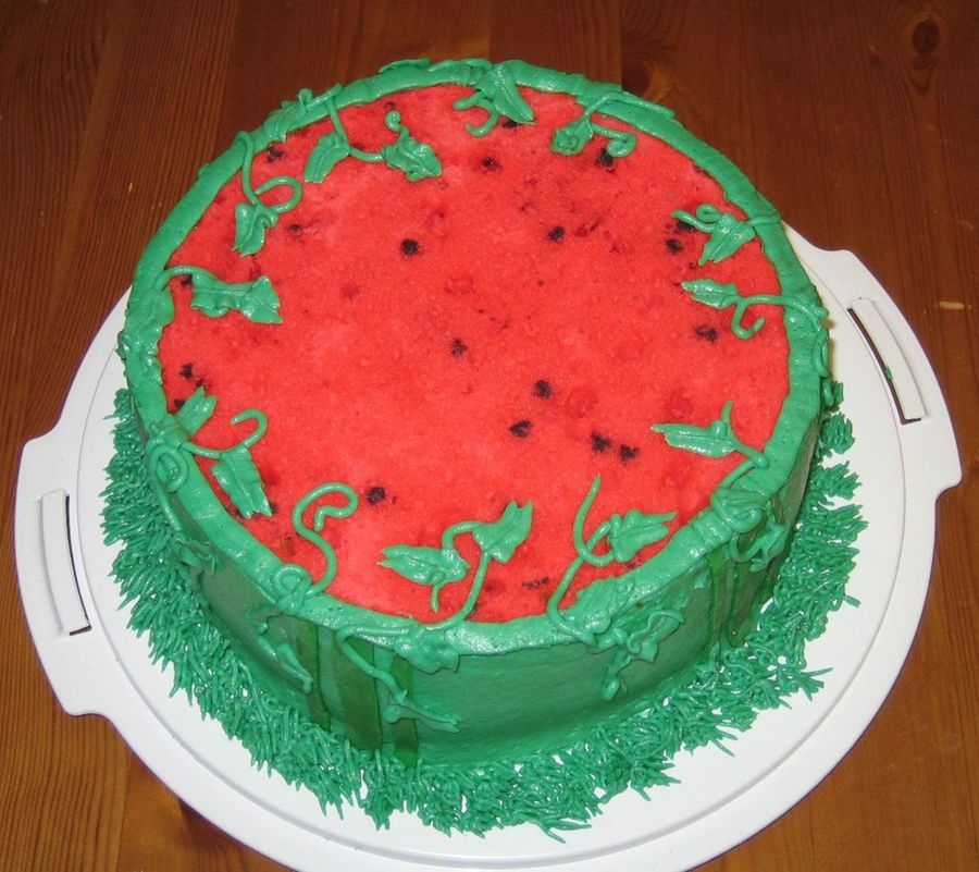 I took the idea from the Wilton Yearbook that was passed around in class one night. Used watermelon flavoring added to a white cake, mini choco chips, buttercream icing with fondant stripes. It sounds weird, but everyone loved it!