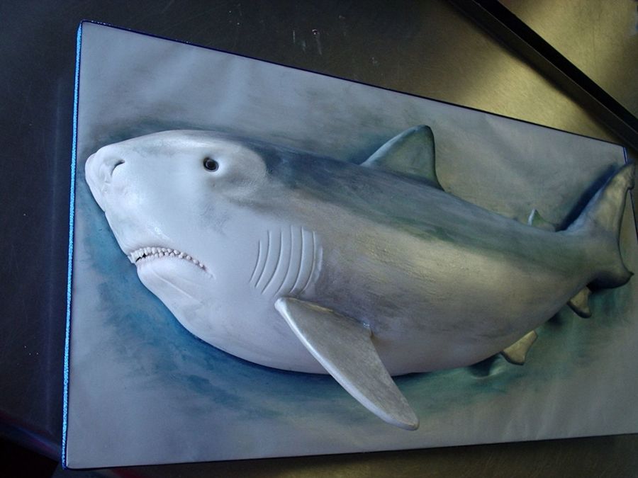 Bull shark groom's cake. Red velvet cake covered with fondant and painted with luster dust.
