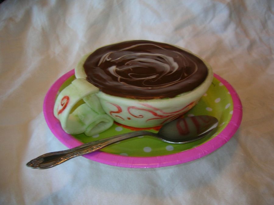 This is a mini cake I made for fun, my version of a "coffee cake." The "coffee" is melted dark and white chocolate, the rest is cake covered in fondant, then hand-painted. I think I would enjoy this cake with, hmmm, a good cup of joe! Beginner.