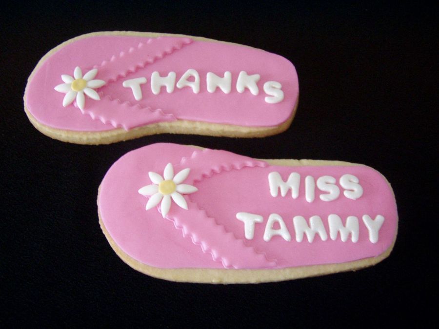 I wanted to do something kind for my children's VBS teacher to express my gratitude. I made the pattern by tracing an actual flip flop. NFSC's w/fondant decorations.