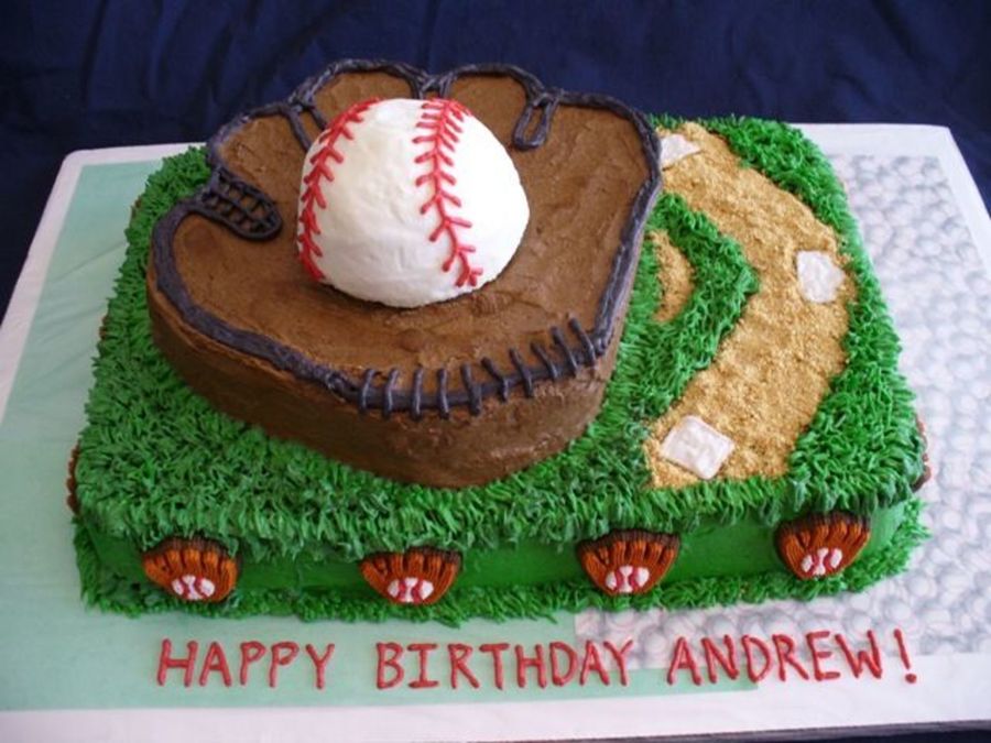9x13 base with buttercream icing and grass tip. 9" round carved down to form the glove wit h buttercream icing. Baseball is from a small bowl that I baked in and carved a little to form the half ball, with buttercream icing. Dirt is graham crackers and bases I piped in the icing. I'm not completely happy with the glove, but I will do better if I do another one.