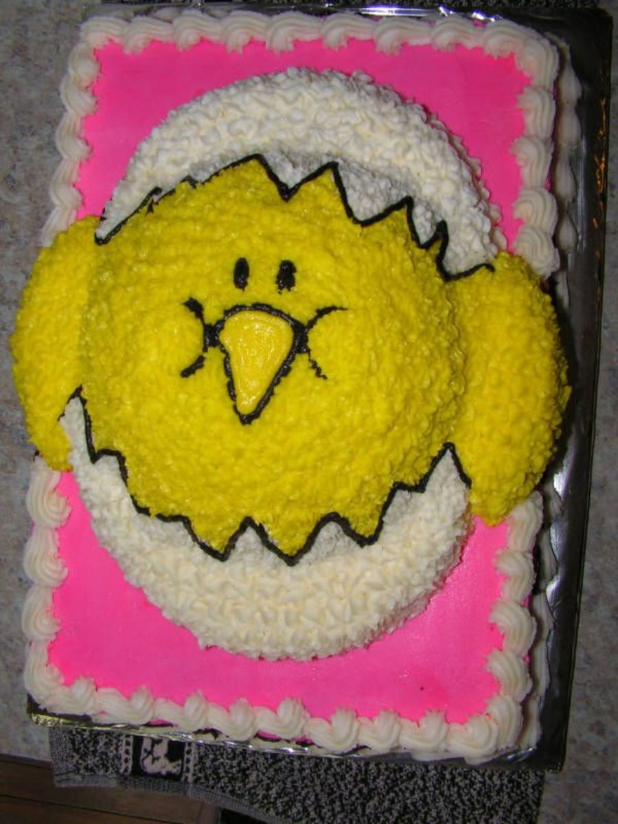 The chick is a 1/2 ball pan..on a 9 x 13 inch slab. All buttercream.