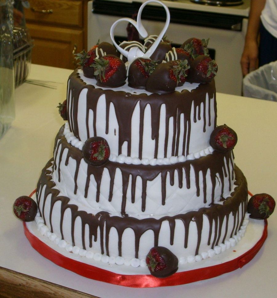 12,10,8 covered in fondant and chocolate drizzles. Chocolate covered strawberries. The groom wanted the diamond pattern, so i incorporated it in. This was my first actual wedding, I was really nervous, but i am pretty pleased with how it turned out.