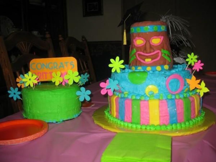 Attempted a graduation cake for my bestfriend's daughter. Gotta Love Florida! Middle tier was strawberry/marshmallow filled, and melted almost instantly when we took it outside to transport!! What a mess! Ended up with two tiers and a seperate cake. Tiki turned out great though! He was made of Rice Crispies and MMF. All tasted great! An of COURSE I didn't take pictures BEFORE transport! UUUUGGHHH!!
