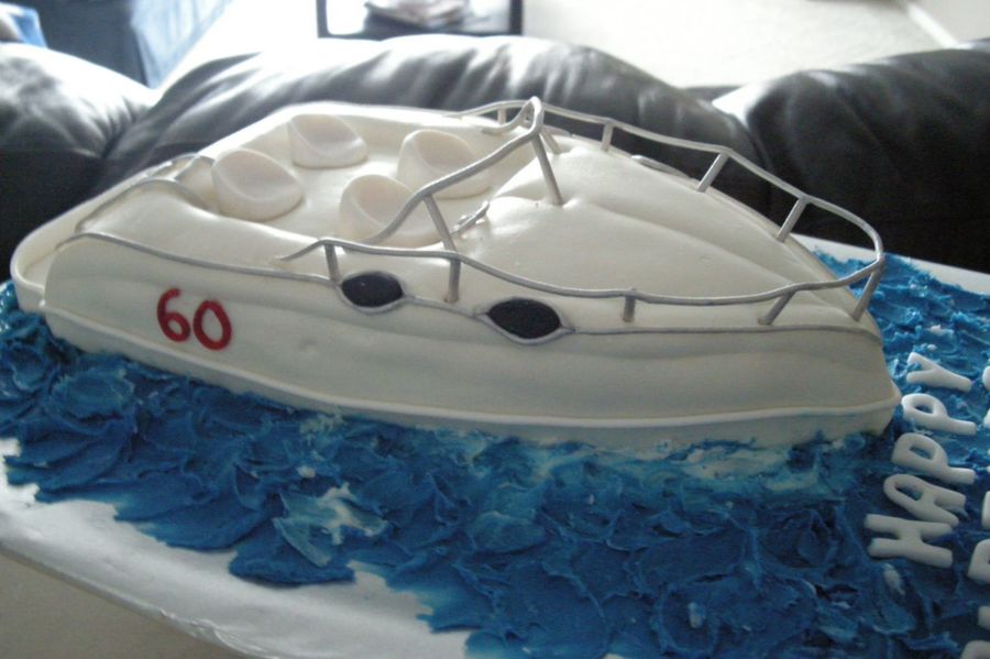 large square cake cut in half and stacked. covered in mmf w gumpaste used for railing (not easy). The waves are colored buttercream. I was trying to match a pic of actual boat the customer wanted copied.