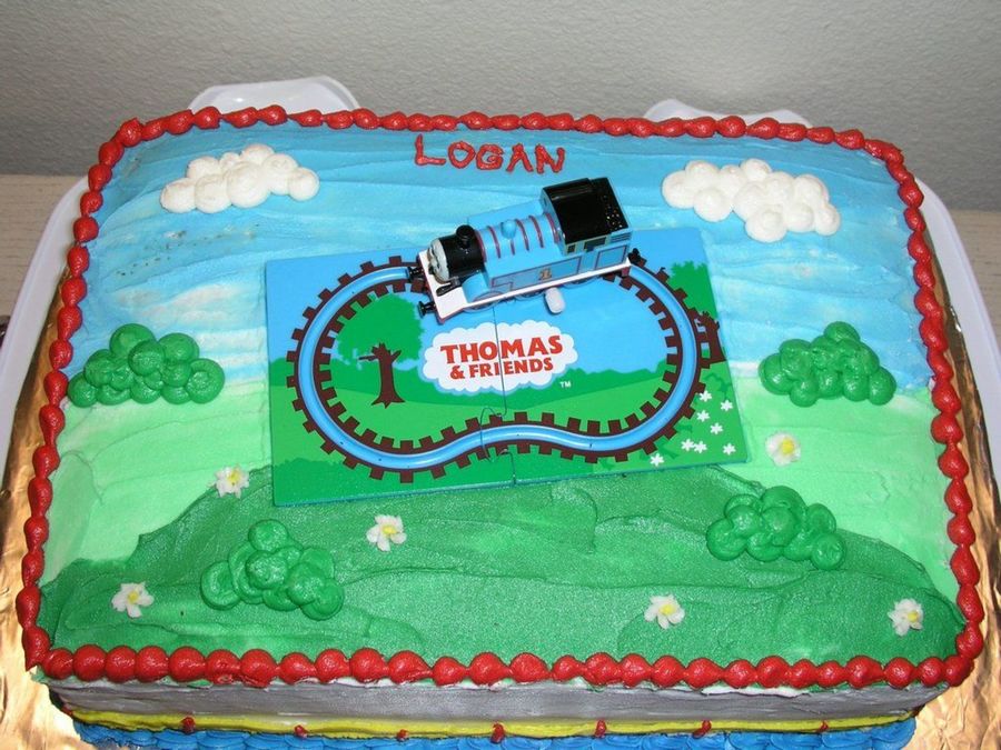 Chocolate cake with chocolate, chocolate chip filling and butter cream icing. Thomas train actually winds up and runs around track!