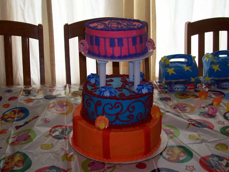 Me and my friend both make cakes and I make her daughter's cakes since she is busy with other things before the party. She designed this and I made it for her. 3-layer cake. Each layer represents the different Doodlebop characters. She added the rings so that the kids could keep them. Thanks for looking!