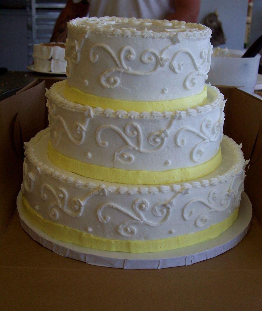All buttercream with buttercream ribbon around the bottom and scroll work. The humidity was horrible this day so it was hard keeping it smooth! Thanks for looking!
