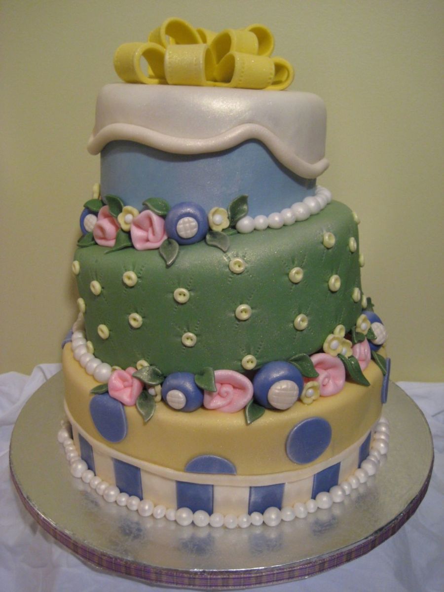 I wanted to design a fun, spring whimsy cake and this is what I came up with. Entire (dummy) cake is covered in fondant with fondant and gum paste accents. Spacers placed between tiers. Cake is covered in (antique white) luster dust, although it does not show too well in picture. The middle tier is supposed to resemble buttons on a quilt!! Thanks for looking!! ~ Jaime