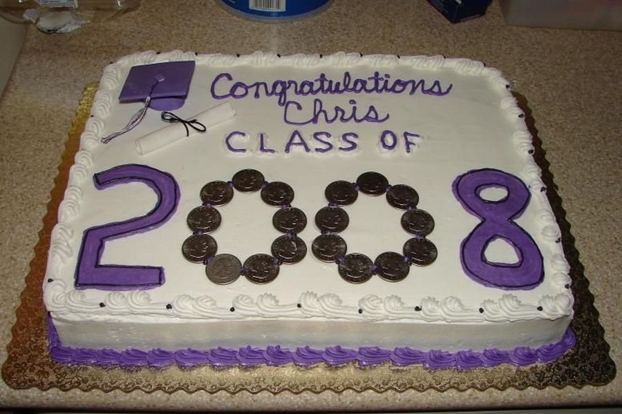 This graduation cake was made with 18 silver dollars (washed well, of course!!) for the boy turning 18 too. I made the cap and diploma out of gumpaste and used embroidery floss for the tassel. The school colors are sliver, purple and black.