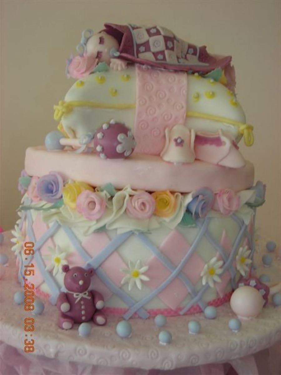 This was my first attempt at a pillow cake. It was not easy! i had fun making the baby items. everything is made out of fondant. I got the idea of the hat box from someone on the cc. It was so beautiful, I had to try it myself.