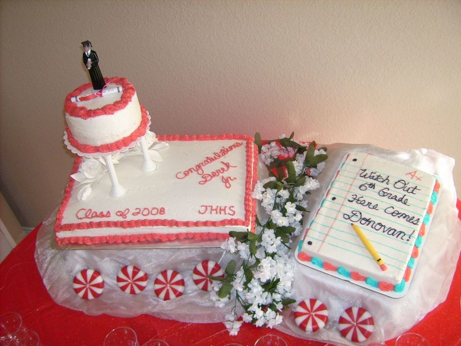 Two cakes done for my sons. One graduating from high school and the other from 5th grade. The "notebook paper" cake was white w/ buttercream icing. The tiered cake bottom was white, tier was chocolate both iced in buttercream.