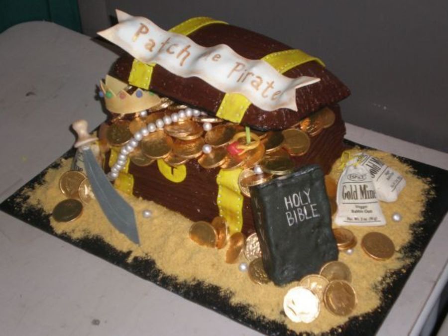 I made this cake for my class I teach at church. It's called Patch the Pirate Club, and has a nautical theme. It was so much fun to make! The necklace, banner, ring, crown, sword are made of fondant. The Bible is a fondant covered rice krispy treat. Store-bought foil covered chocolate coins, and "gold" bubble gum sacks. The lid is rice krispy treat also. Graham cracker crumbs for sand. Thanks to all who posted pics of their treasure chest cakes, for me to be inspired by!