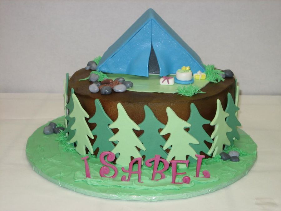 Did as a gift. 10 inch round chocolate. Gumpaste trees, rock, cake, gifts, and wood for the fire pit. Tent is styoform covered with gumpaste. Cake is the airbrushed with pearl luster dust. To see close up of top of cake you can go here: http://family.webshots.com/photo/2522165280040454985hDNjQj