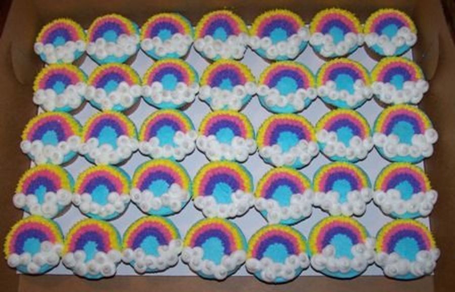 Simple Rainbow cupcakes iced in BC. I used a small star tip for the rainbow and a large round tip for the clouds.