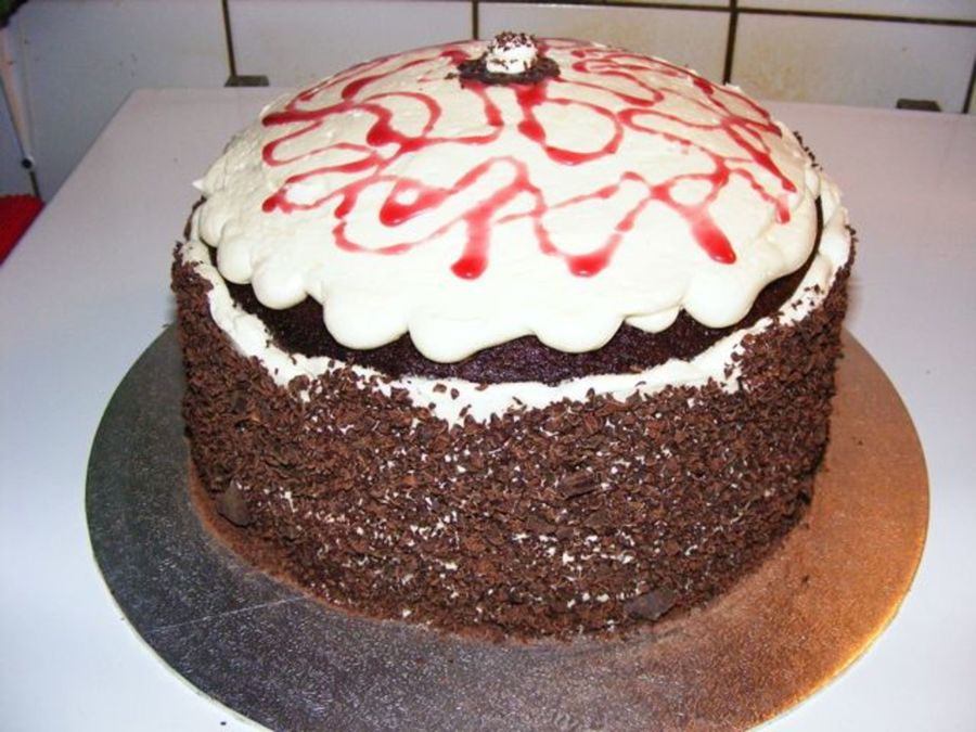 Using the CC recipe, a 3-tier chocolate cake, layered with buttercream & thickened tart cherries, non-traditional Black Forest looking, but YUMMERS! I will so be using this recipe again!