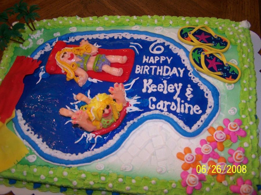 Pool party with handmade fondant people and buttercream icing. First attempt at fondant decorations. Store bought flip flops and trees.