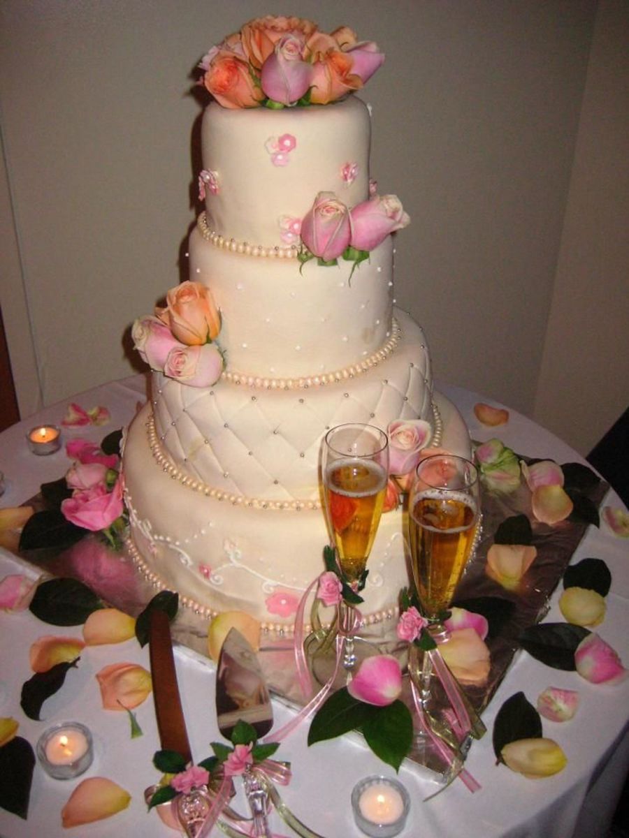 My first wedding cake. Pheewww....it's an 16-12-8-6 in cake, all covered in ivory fondant. Still needs a lot of improvement, but hopefully it's good enough :)