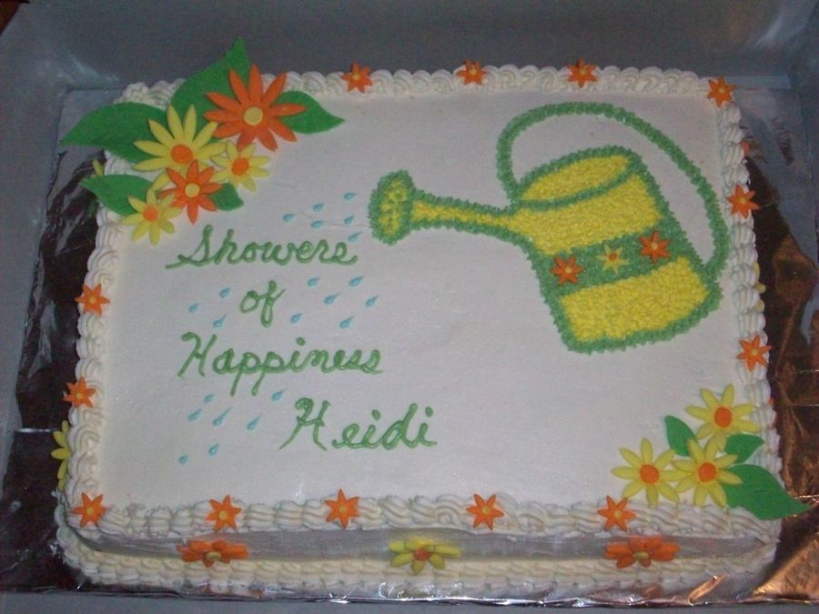 Bridal shower for a second marriage. The cake was white cake with white buttercream icing. The flowers were fondant. The table centerpiece decorations were watering cans with flowers, which made a nice take away favor for a guest. All other guests received small watering cans with flowers as favors. It was great.