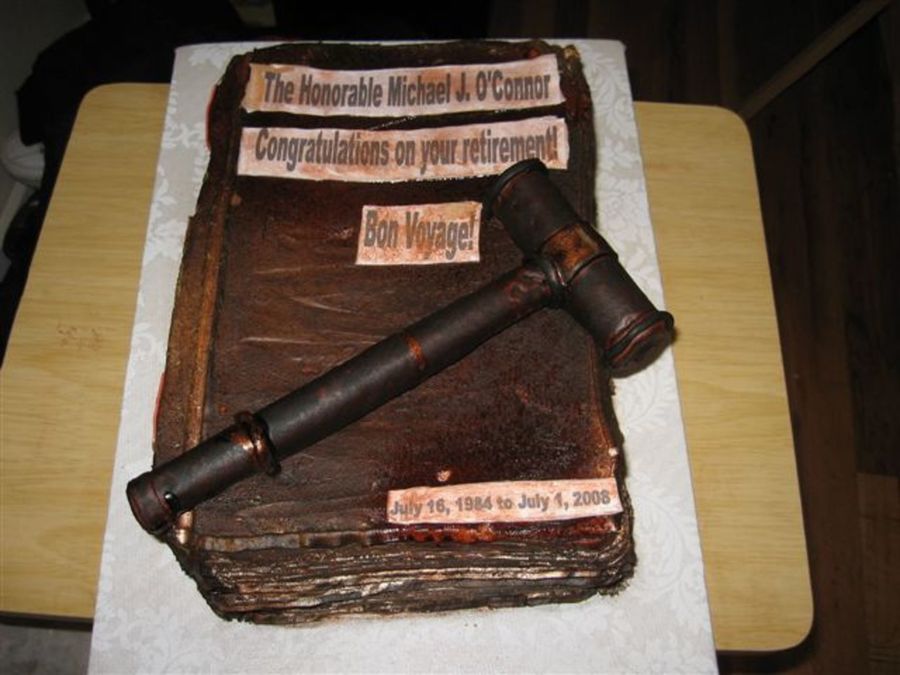 I used to work at the Courthouse and was asked to make the retirement cake for one of the Judges. I think it turned out pretty good. Cake is 2 9x13 cakes stacked and then sprayed. The gavel is pillars covered in fondant. I wanted to make edible images for the wording since I can't write to save my life, but the store was not very nice about it so it is just printed paper on fondant.