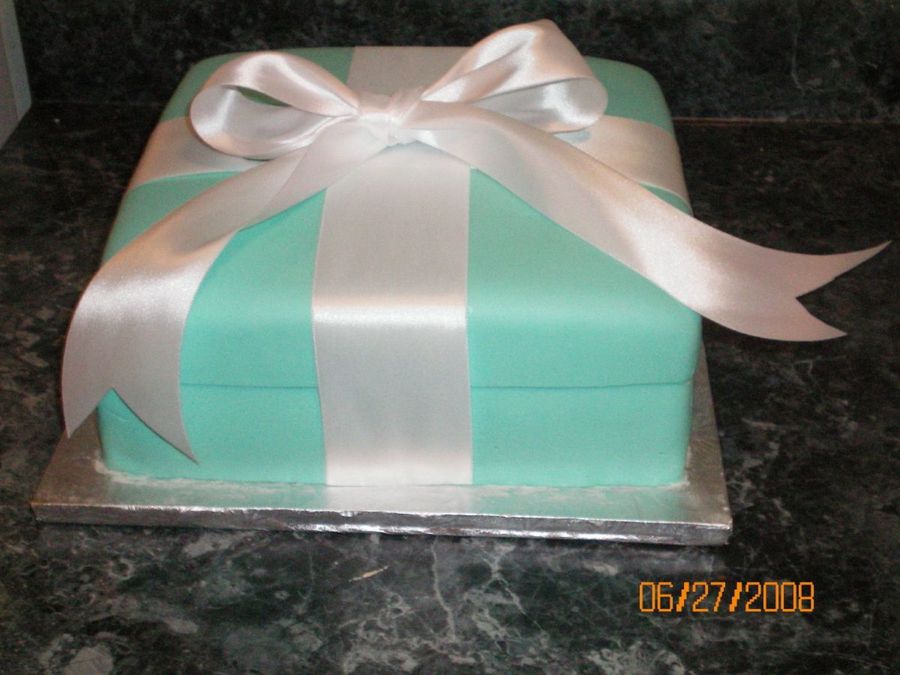 The brides mom gave me a Tiffany Box to duplicate the color for her daughter's bridal shower. The ribbon is satin. I used press n' seal underneath the satin ribbon, cut the same width, then brushed on some vanilla and stuck the ribbon on the the cake. It's a buttercake w/almond flavored buttercream icing.