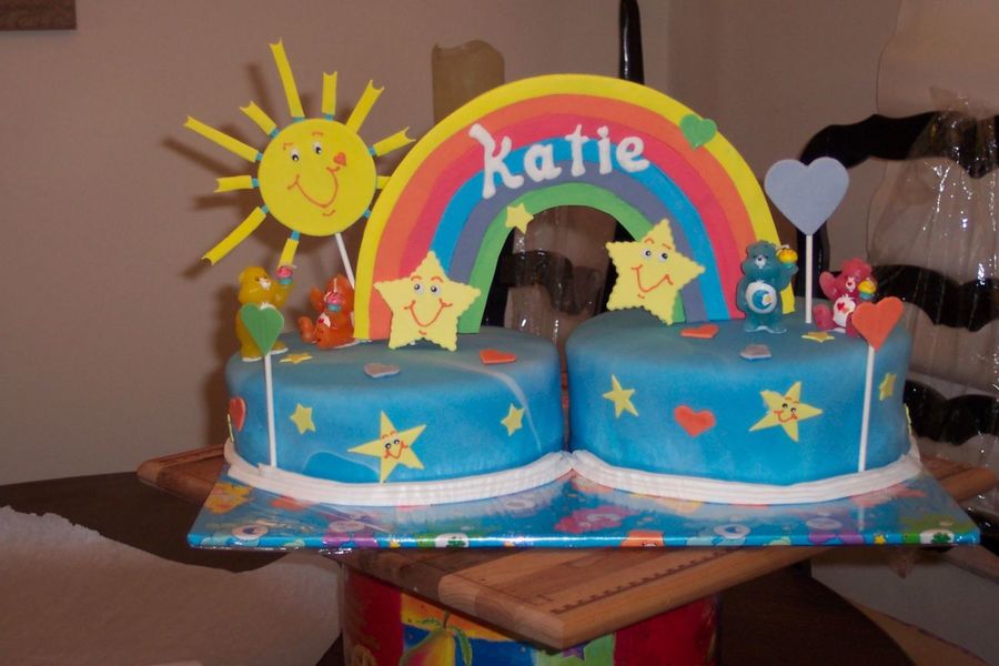 chocolate cake and vanilla cake covered in marshmallow fondant; decorations are gumpaste and fondant; carebears were candles that were provided to me