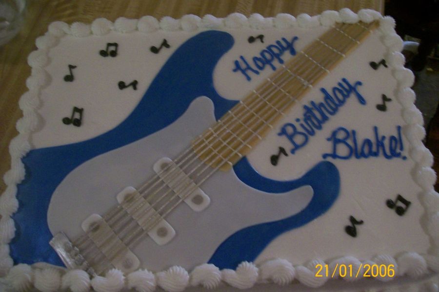 sorry for the blurry pic; fondant guitar with silver painted long spagetti strings