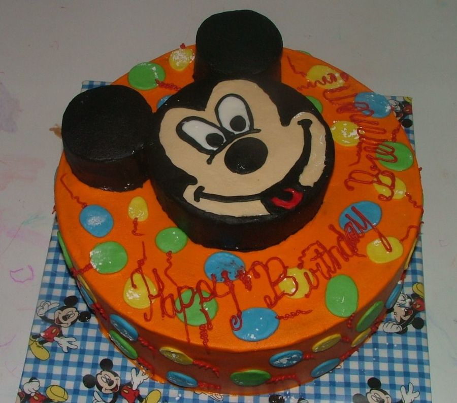 12' round yellow cake with BC icing. The Mickey face was a 6" round with 2 biscuit size ears. I am not an artist by any means, but I did my best. For a 6yr boy. Mom was happy. I brushed all the corn starch off before delivery.