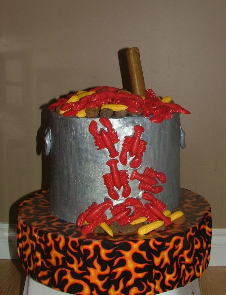 Big cake for a large company's crawfish boil. The crawfish and corn are chocolate, the potatoes were chocolate marshmellows, and the spoon was butterscotch. Cake was 4 12" rounds stacked yellow cake with BC icing. Covered in silver pearl dust.
