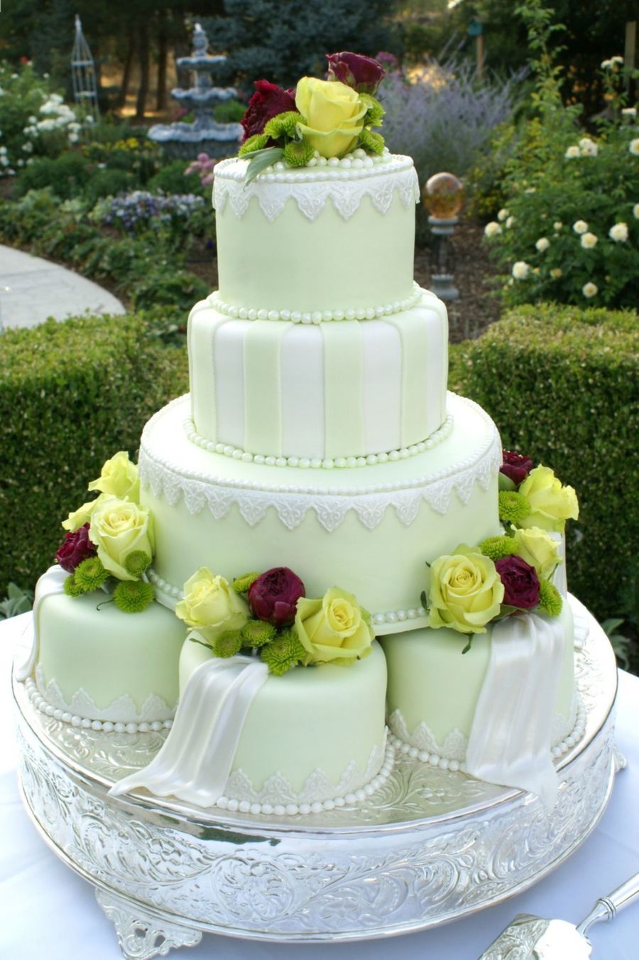 A very special cake I have been waiting to do for 24 years! My Daughters 6" coconut cakes with coconut filling 12" white cake with Apricot filling 8" lemon cake with raspberry filling and the top was coconut. All fondant and fondant accents and real flowers. I used Jennifer Dontz's Lady windemere design.. Thank's Jennifer..