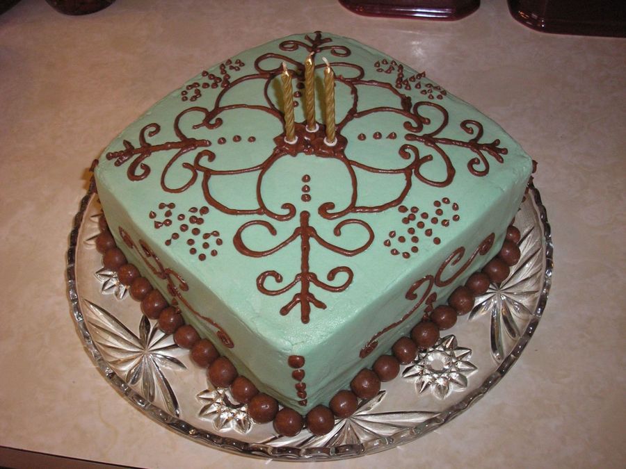 my very first square cake. i don't care for corners. birthday cake for my hubby. vanilla cake with strawberries and cream cheese. sage green b/c with chocolate b/c scroll work trimmed with whoppers.