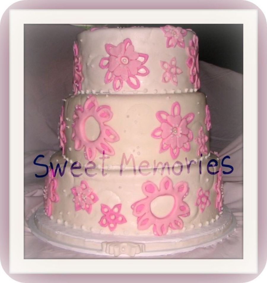 12" - WASC w/raspberry mousse, 10" - yellow w/chocolate-espresso ganache, 8" - Grand Marnier w/vanilla custard. All tiers covered and deocrated with MMF. I'm not at all pleased with this cake. I had a terrible time with the MMF and the cutouts were a nightmare to get to hold their shape. I'm not sure I'll use MMF again. TFL