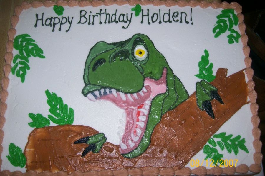 hand-painted dinosaur on buttercream. Funny thing is, the night I did this cake I had a dream that a huge dinosaur was in my backyard eating my cats. First time a cake has made it into my dreams!