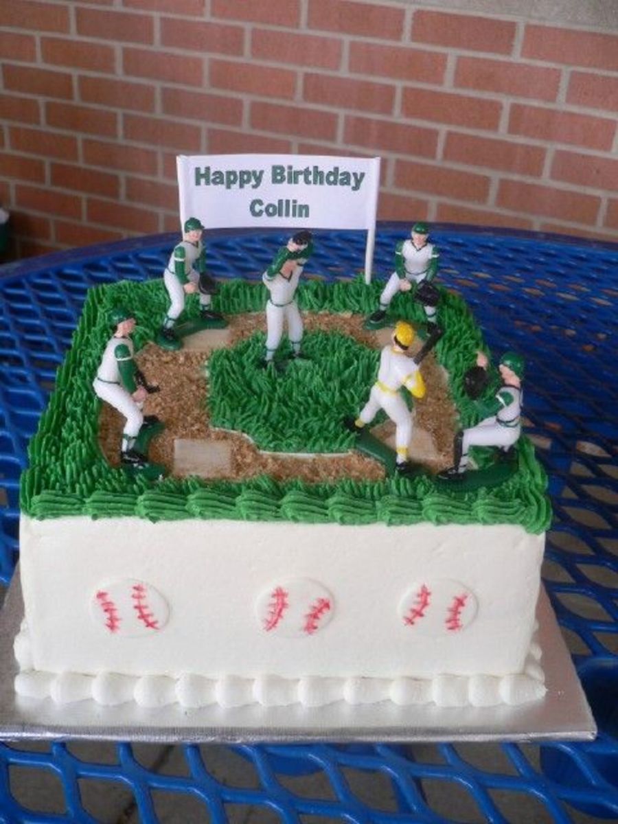 8" Square cake, made to resemble photo supplied by customer, so dont know who to give design credit to. Buttercream with mmf baseballs and crushed ice cream cone for the dirt!