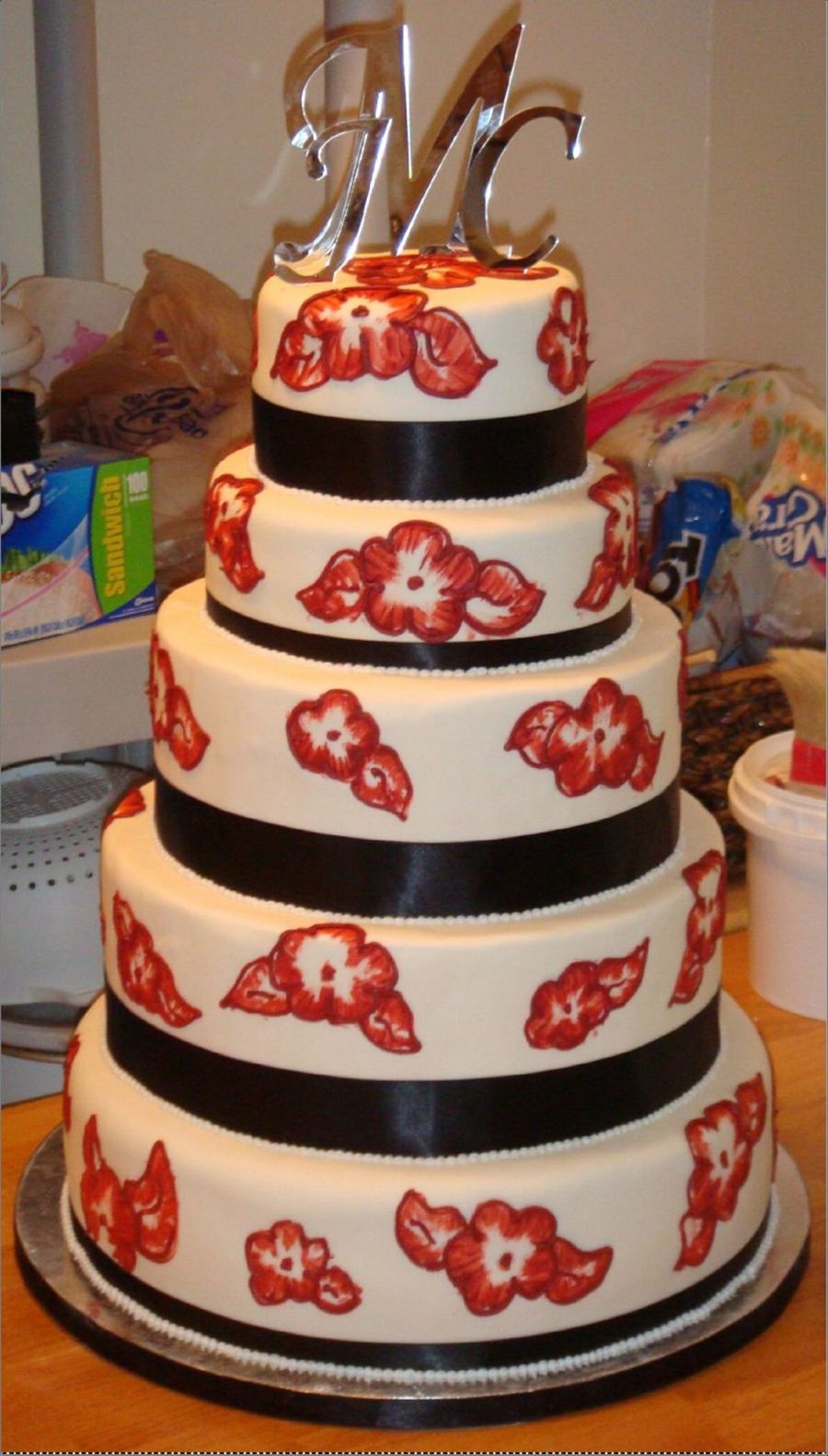 I did this for a friends wedding... 14" White almond sour cream cake with rasp filling, 12" and 10" are fakes, 8" and 6" are chocolate chocolate grand marnier. Fondant and my "attempt" at embroidary.... Please be honest and let mw know what you think....I think they were mad at me about it...