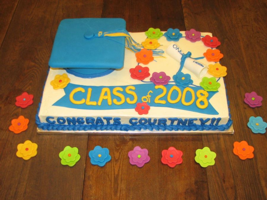 This was an Aloha-themed graduation cake. 1/2 white and 1/2 chocolate cake with b/c icing. Fondant cap, tassle, diploma and flowers.