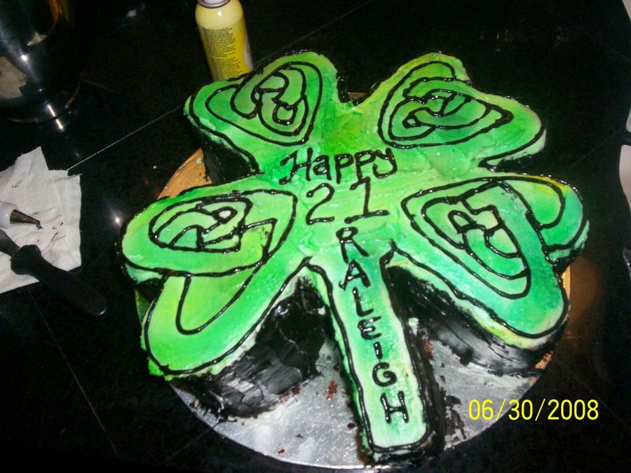 i made this cake for my friends 21st birthday. he is irish and he loved it! i started out with a circle and free handed the shamrock cutting it out then iced it and air brushed the top with green black and yellow coloring.
