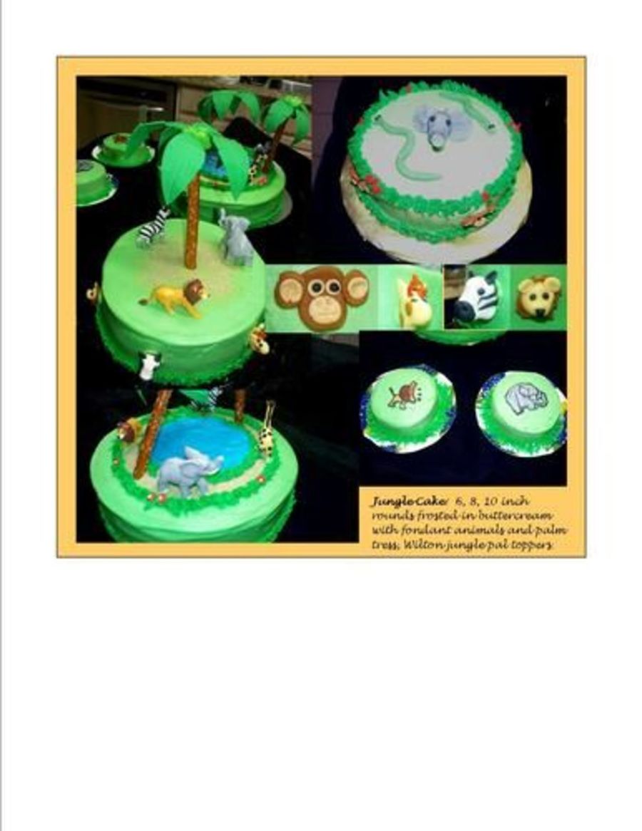 This is my version of the Wilton Jungle cake. 6, 8 & 10 inch rounds frosted in buttercream. Animal faces and palm trees are fondant/gumpaste with the Wilton Jungle Pals toppers. The two tiny ones are smash cakes for the twins with BCT.