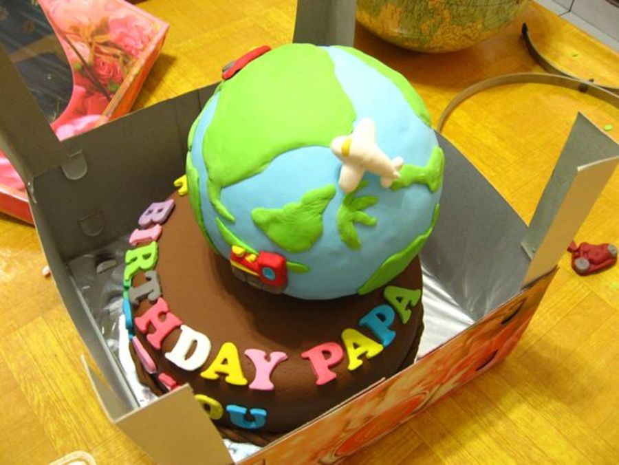 The globe was made from a dummy, all covered with rolled fondant. The b-day Papa loves traveling very much. This cake was his daughter's idea :D