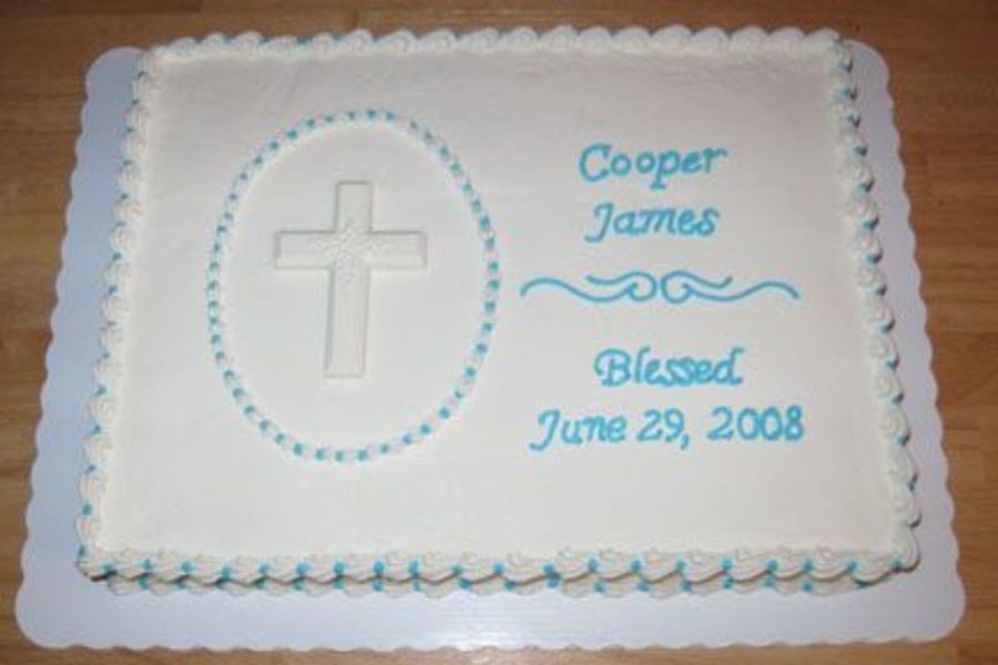 Half sheet cake with buttercream frosting. Shell oval border with white chocolate cross mold inside. Scroll work from pattern press. Shell border with dots for top and bottom borders.
